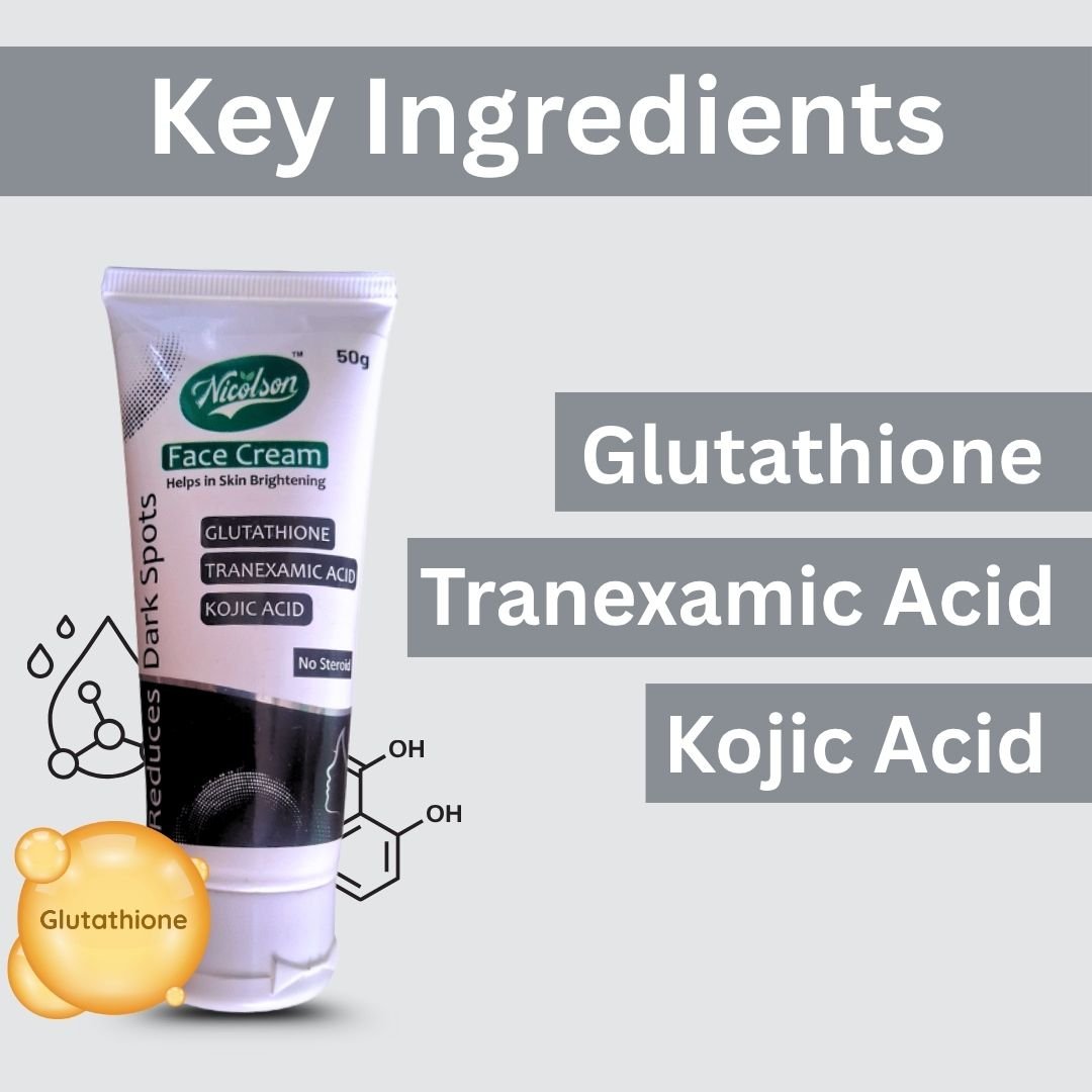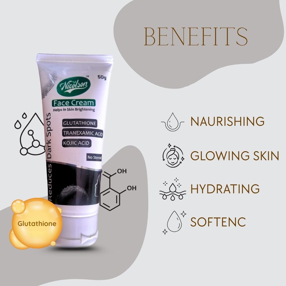 Bring out your natural glow with Nicolson Face Cream, a powerful blend of Vitamin C, Kojic Acid, Glutathione, and Tranexamic Acid that works to brighten, repair, and nourish your skin. This lightweight, non-greasy formula deeply hydrates, reduces pigmentation, minimizes dark spots, and protects your skin from sun damage with Octyl Methoxycinnamate (UV filter).