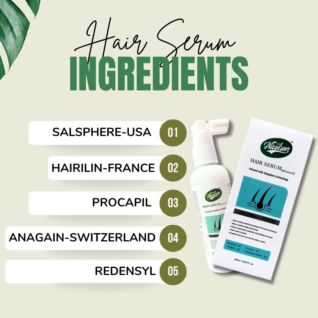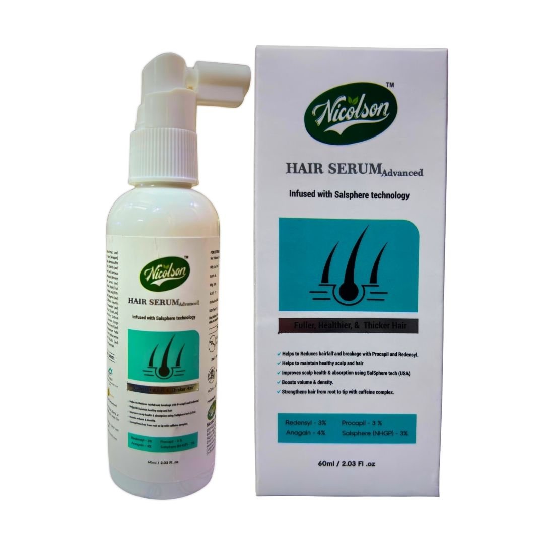 Nicolson Hair Serum is an advanced Ayurvedic and scientific blend formulated to fight hair fall, promote natural hair growth, and rejuvenate the scalp. Powered by globally recognized active ingredients like Redensyl, Anagain, Procapil, and Capilia Longa, this serum targets the hair follicles to stimulate growth from the root while strengthening existing strands. Its unique, lightweight, and non-greasy formula nourishes the scalp and restores vitality to weak, dull, and thinning hair.